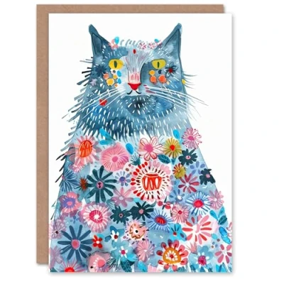 Artery8 Greeting Card Blue Kitty Covered in Flowers Cat Lover Folk Art Blank For Him Or Her Birthday