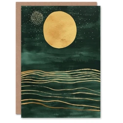 Artery8 Greeting Card Boho Abstract Full Moon Dark Green Gold Seascape Blank For Him Or Her Art Birthday