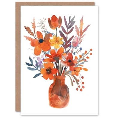 Artery8 Greeting Card Bright Autumnal Flower Bouquet Vase Watercolour For Her Woman Birthday