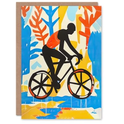 Artery8 Greeting Card Bright Colourful Cyclist on Bicycle Painting Bold For Him Man Birthday