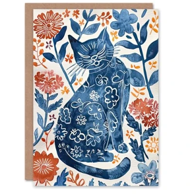Artery8 Greeting Card Cat Lover Blue Red Floral Japanese Style Pattern Blank For Him Or Her Art Birthday