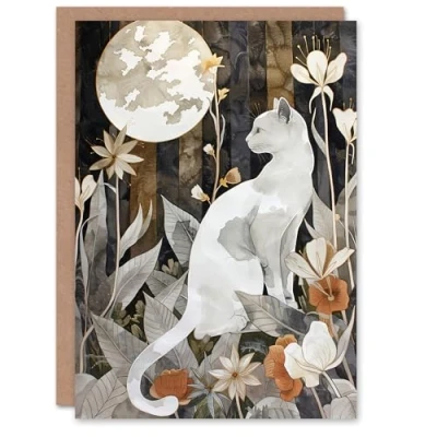 Artery8 Greeting Card Cat Lover Floral Forest Full Moon Watercolour Blank For Him Or Her Art Birthday