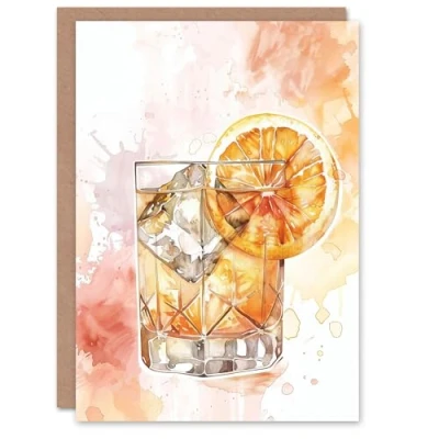 Artery8 Greeting Card Classic Old Fashioned Cocktail Orange Watercolour Blank For All Him Or Her Art Birthday