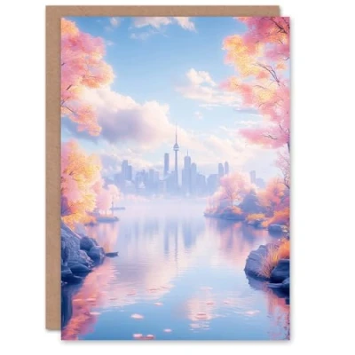 Artery8 Greeting Card Coastal Pink Orange Autumn Trees Lake Cityscape Blank For Him Or Her Art Birthday