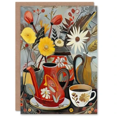 Artery8 Greeting Card Coffee Pot Cup Wildflower Bouquet Vase Painting Blank For Him Or Her Art Birthday