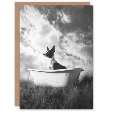 Artery8 Greeting Card Collie in a Bathtub Black White Surreal Dog Lover Blank For Him Or Her Art Birthday