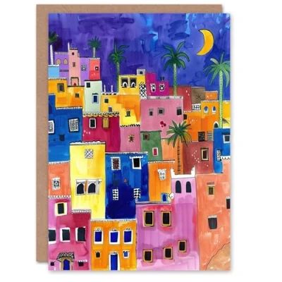 Artery8 Greeting Card Colourful Moroccan Cityscape At Night Watercolour Blank For Him Or Her Art Birthday