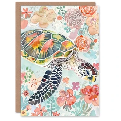 Artery8 Greeting Card Colourful Sea Turtle Marine Flowers Watercolour For Her Woman Birthday