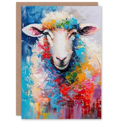 Artery8 Greeting Card Colourful Sheep Fun Animal Portrait Oil Painting Blank For Him Or Her Art Birthday