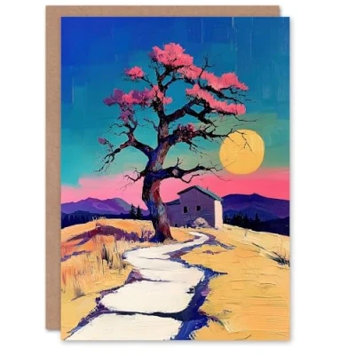 Artery8 Greeting Card Cottage Cherry Blossom Tree Sunrise Landscape Blank For Him Or Her Art New Home