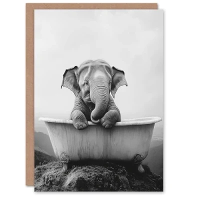 Artery8 Greeting Card Cute Baby Elephant In Bathtub Black White Surreal Blank For Him Or Her Art Birthday