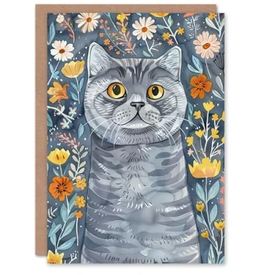 Artery8 Greeting Card Cute Blue British Shorthair Cat Lover Floral Pet For Her Woman Birthday
