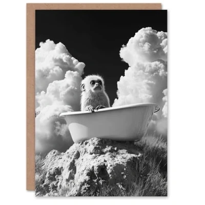 Artery8 Greeting Card Cute Marmoset in Bathtub Black White Surreal Blank For Him Or Her Art Birthday