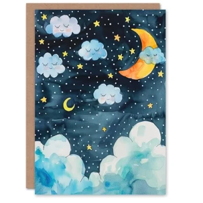 Artery8 Greeting Card Cute Night Sky Stars Moon and Sleeping Clouds For Child Kids Birthday