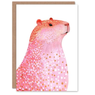 Artery8 Greeting Card Cute Pink Capybara White Gold Polka Dot Fur Coat For Her Woman Birthday