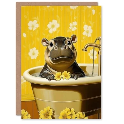 Artery8 Greeting Card Cute Pygmy Hippo Bath Time Yellow Daisy Bathroom For Her Woman Birthday