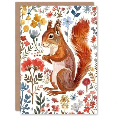 Artery8 Greeting Card Cute Red Squirrel Bright Floral Watercolour For Her Woman Birthday