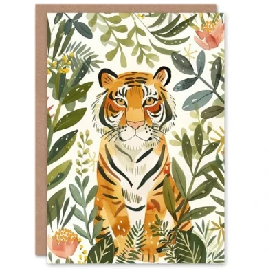 Artery8 Greeting Card Cute Tiger in Floral Tropical Jungle Watercolour Blank For Him Or Her Art Birthday