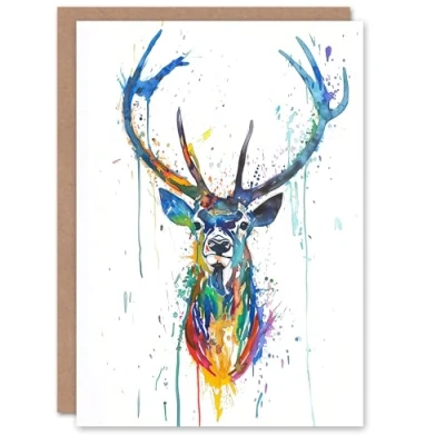 Artery8 Greeting Card Deer Stag Colourful Ink Splat Bright Portrait Blank For Him Or Her Art Birthday