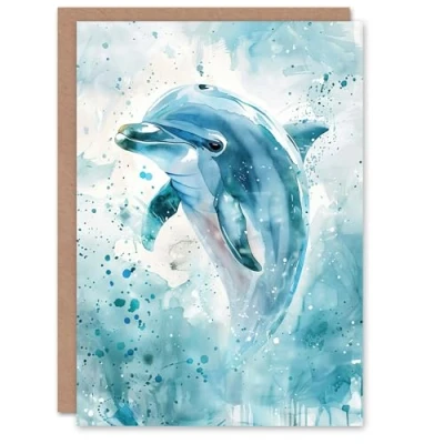 Artery8 Greeting Card Dolphin Wave Jump Watercolour Light Blue Sea Blank For All Him Or Her Art Birthday