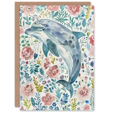 Artery8 Greeting Card Dolphin with Wildflowers Pink Blue Watercolour For Her Woman Birthday