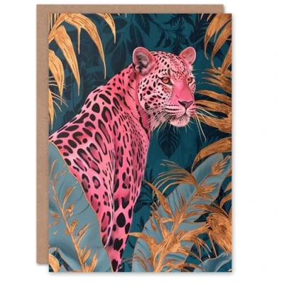 Artery8 Greeting Card Elegant Pink Leopard in Blue Gold Tropical Jungle Blank For Him Or Her Art Birthday