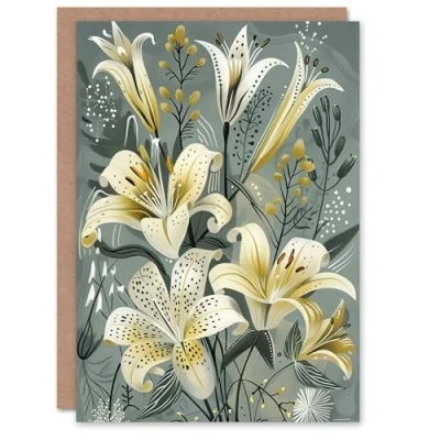 Artery8 Greeting Card Elegant White Lily Bouquet Grey Gold Floral Blank For All Him Or Her Art Birthday
