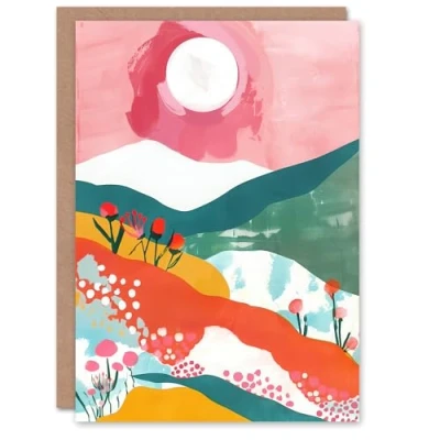 Artery8 Greeting Card Floral Mountain Pink Sunset Colourful Abstract Blank For Him Or Her Art Birthday