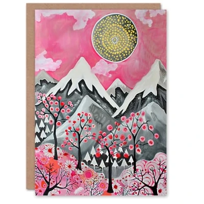 Artery8 Greeting Card Folk Art Mountain Range Sunset Cherry Blossom Blank For Him Or Her Birthday