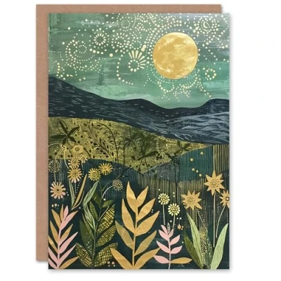 Artery8 Greeting Card Full Moon Floral Landscape Folk Art Painting Blank For Him Or Her Birthday