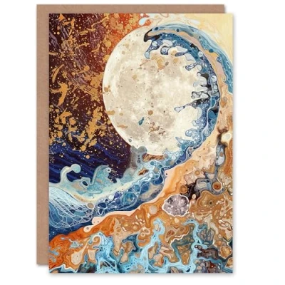Artery8 Greeting Card Full Moon Great Ocean Wave Modern Art Gold Blank For Him Or Her Birthday