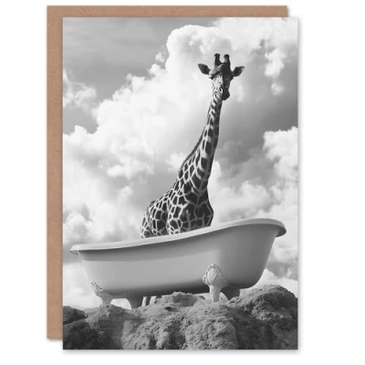 Artery8 Greeting Card Giraffe in Bathtub on a Hill Black White Surreal Blank For Him Or Her Art Birthday