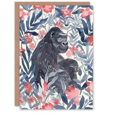 Artery8 Greeting Card Gorilla Ape and Pink Tropical Flowers Watercolour For Her Woman Birthday