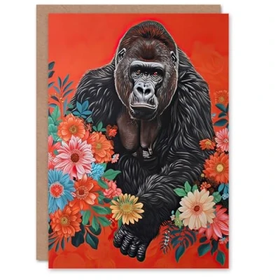Artery8 Greeting Card Gorilla in Bright Flowers Painting Red Animal Blank For Him Or Her Art Birthday
