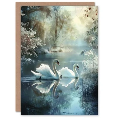 Artery8 Greeting Card Graceful Swans Tranquil Winter Lake Painting Blank For All Him Or Her Art Birthday