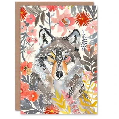 Artery8 Greeting Card Grey Wolf Pink Floral Watercolour Animal Portrait For Her Woman Birthday