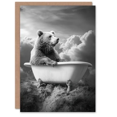 Artery8 Greeting Card Grizzly Bear Mountain Bathtub Black White Surreal Blank For Him Or Her Art Birthday