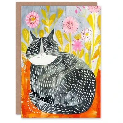 Artery8 Greeting Card Happy Maine Coon with Flowers Cat Lover Folk Art For Child Kids Birthday