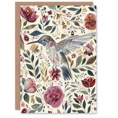 Artery8 Greeting Card Hummingbird with Rustic Flower Pattern Muted Tones For Her Woman Birthday