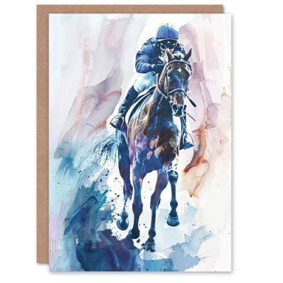 Artery8 Greeting Card Jockey on Racehorse Modern Watercolour Light Blank For All Him Or Her Art Birthday