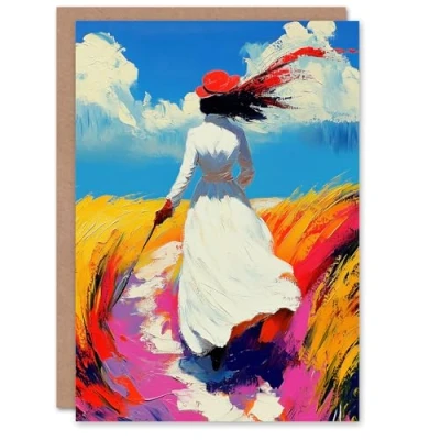Artery8 Greeting Card Lady Walking Through Windy Wheat Field Landscape Blank For Him Or Her Art Birthday