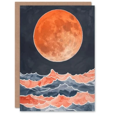 Artery8 Greeting Card Large Orange Full Moon Over Pink Blue Ocean Waves Blank For Him Or Her Art Birthday