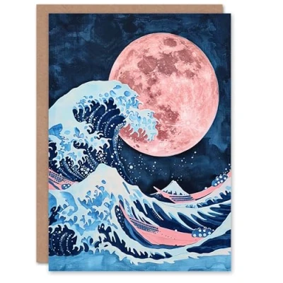 Artery8 Greeting Card Large Pink Full Moon Great Wave Surreal Painting Blank For Him Or Her Art Birthday
