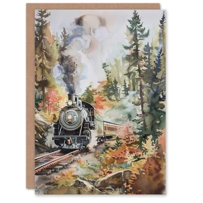 Artery8 Greeting Card Locomotive Train on Autumn Forest Railway Track Blank For Him Or Her Art Birthday