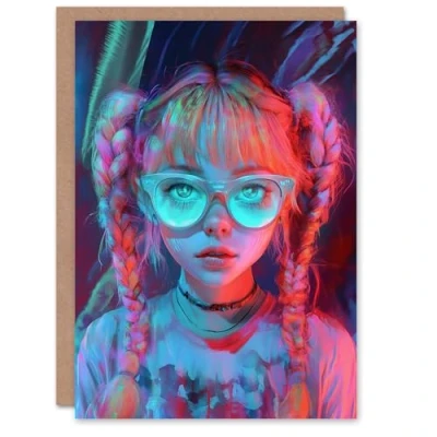 Artery8 Greeting Card Nerdy Girl Braid Pigtails Glasses Neon Pink Blue For Child Kids Birthday