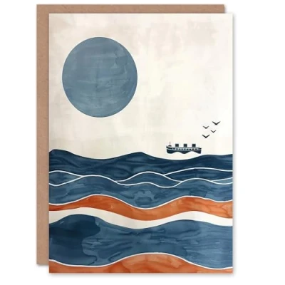 Artery8 Greeting Card Ocean Liner Ship Seagulls Full Moon Over Waves Blank For Him Or Her Art Birthday