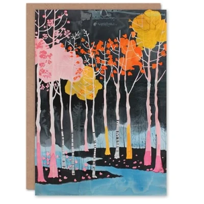 Artery8 Greeting Card Orange Yellow Pink River Birch Trees Watercolour Blank For Him Or Her Art Birthday