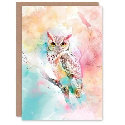 Artery8 Greeting Card Owl on Branch Portrait Pastel Rainbow Watercolour Blank For All Him Or Her Art Birthday