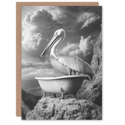 Artery8 Greeting Card Pelican Bird in Bathtub Black White Cliff Surreal Blank For Him Or Her Art Birthday