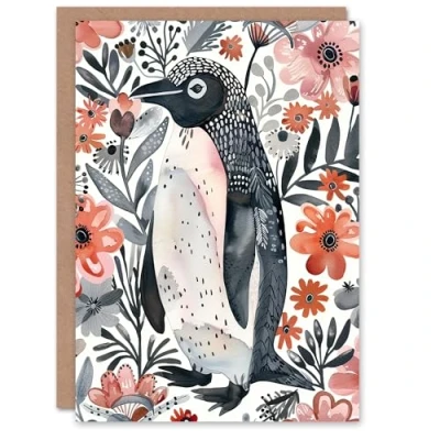 Artery8 Greeting Card Penguin with Pink Flowers Watercolour Folk Art Blank For Him Or Her Birthday
